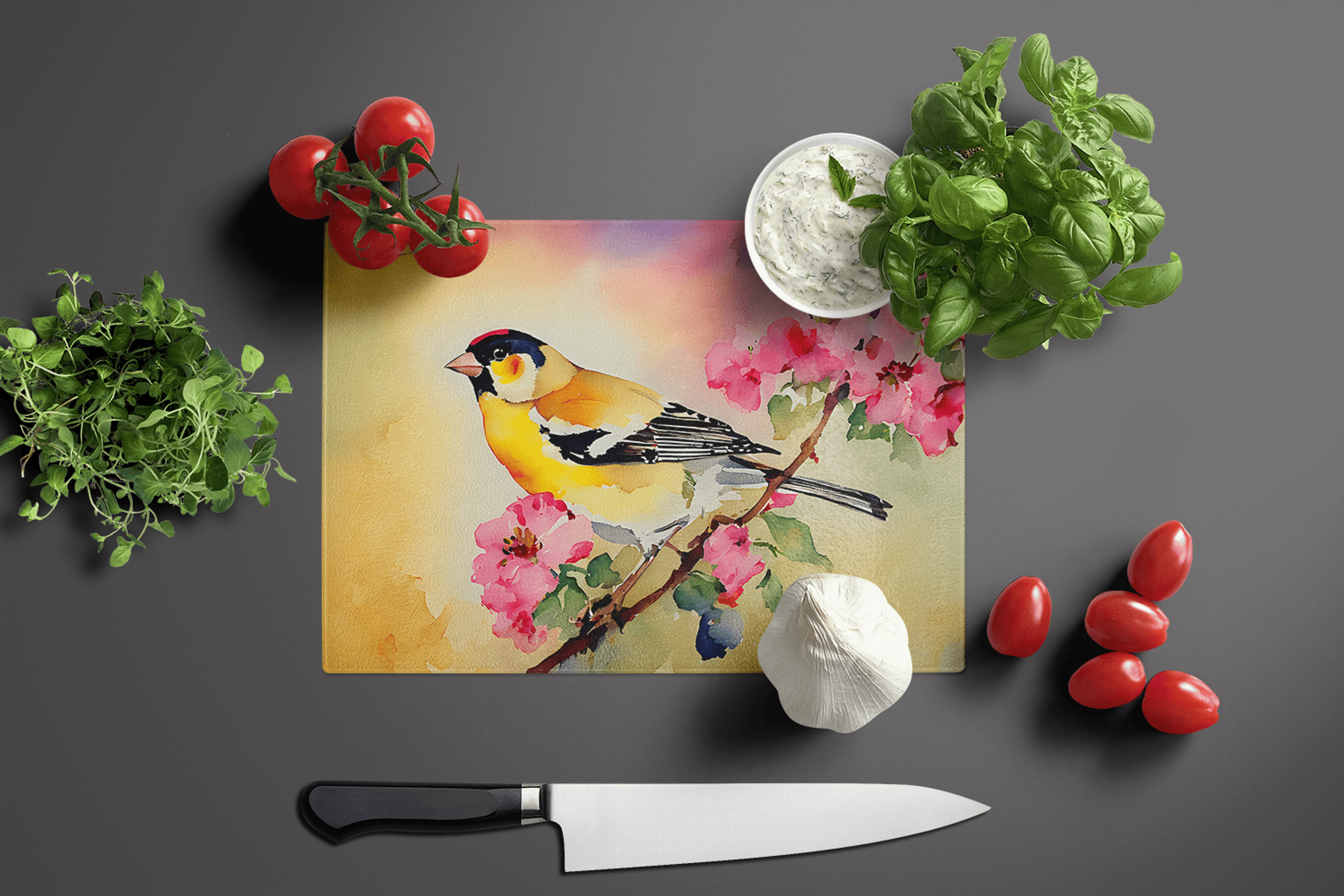 Glass Cutting Board featuring breed specific Goldfinch artwork. Introduce your kitchen to the vibrant, large Decorative Glass Cutting Board from Caroline's Treasures. Crafted from resilient tempered glass, this board is not only a utilitarian necessity but also a colorful art piece. With its generous dimensions of 15 inches in height and 12 inches in length, it offers ample space for all your cutting needs.