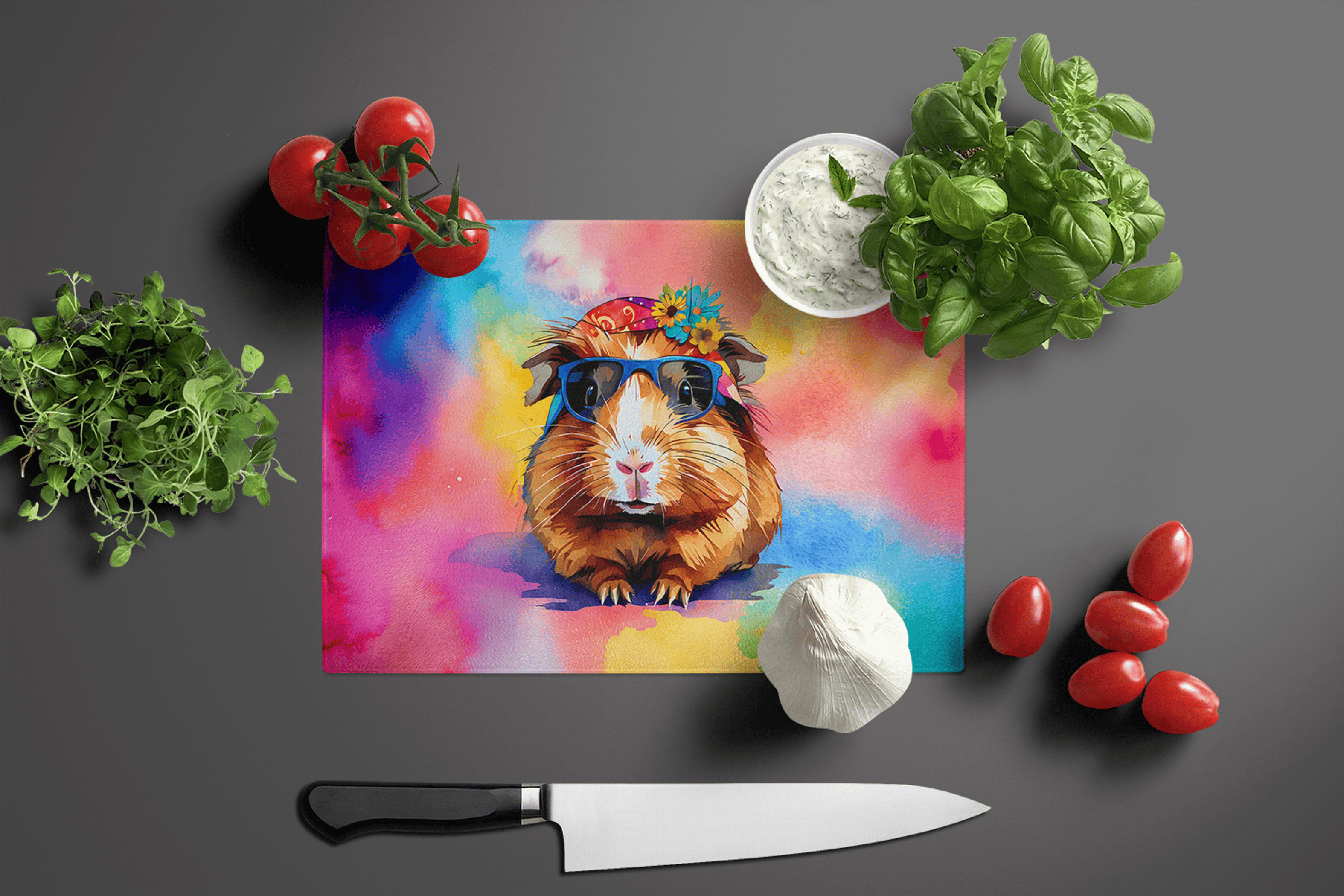Add fun and quirky vibes to your kitchen with our Hippie Animal Guinea Pig Glass Cutting Board, featuring a colorful and whimsical guinea pig design printed on durable tempered glass. Perfect for chopping, slicing, or serving, this scratch-resistant, odor-resistant, and heat-resistant board combines playful artistry with practical functionality. A delightful addition for animal lovers and those who enjoy a touch of whimsy in their culinary space.