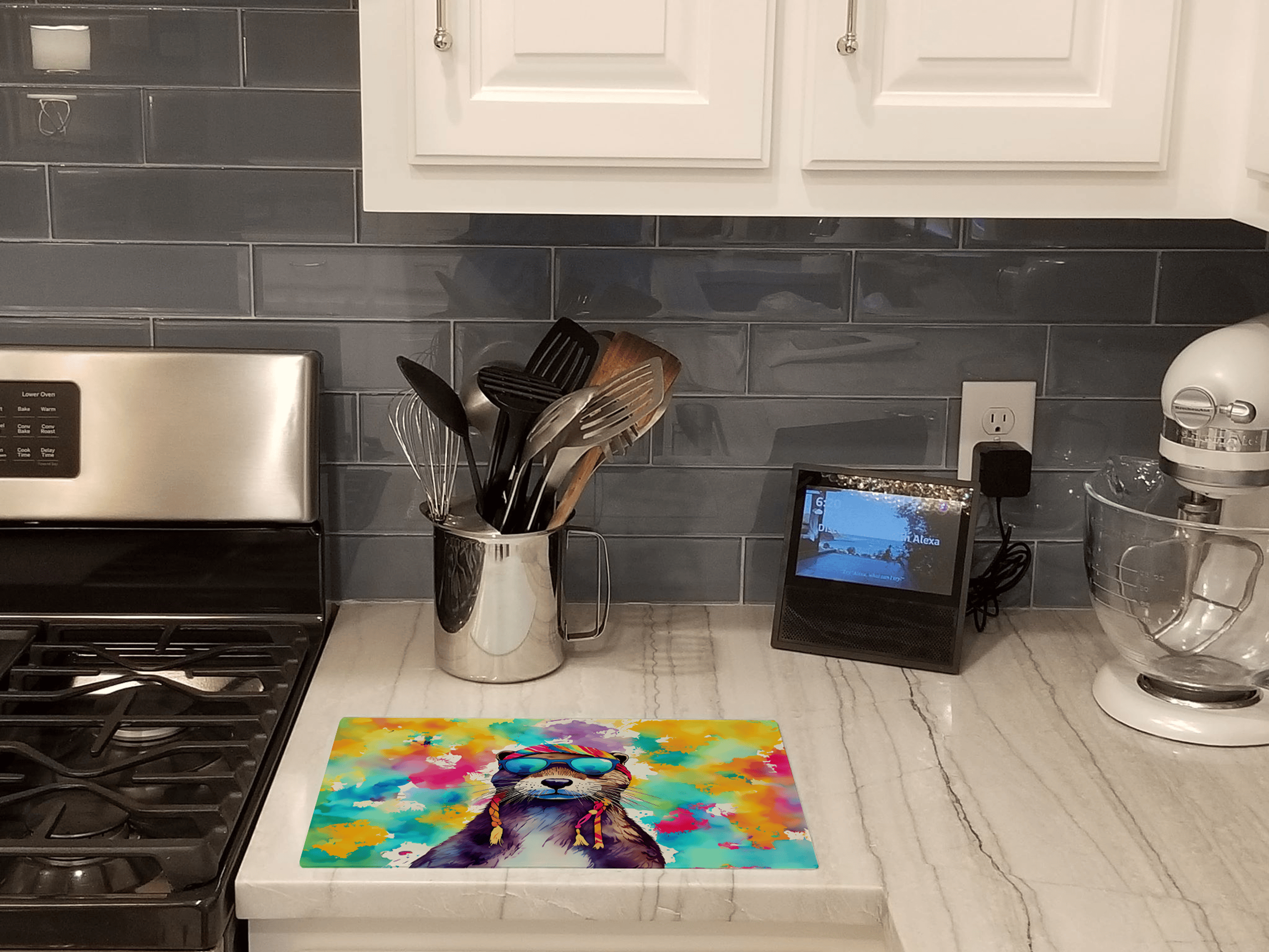 Add a splash of personality to your kitchen with this Hippie Animal Otter Glass Cutting Board, featuring an adorable otter styled in colorful boho fashion. Made from durable tempered glass, this cutting board provides a non-porous, odor- and stain-resistant surface that's ideal for slicing fruits, vegetables, cheeses, and more. Its fun and artistic design makes it a standout piece for food prep, serving, or kitchen decor—perfect for otter lovers and fans of whimsical, nature-inspired style.