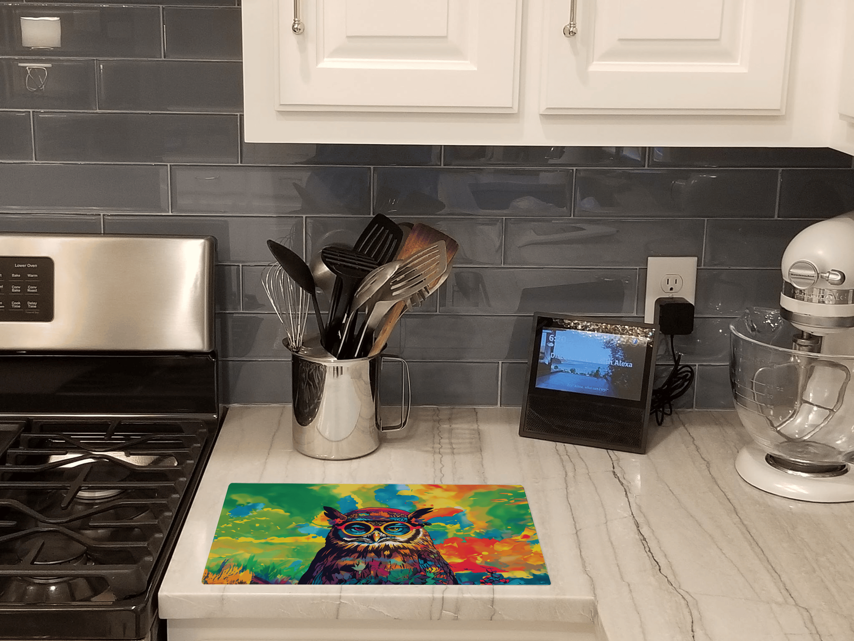 Add a wise and whimsical touch to your kitchen with this Hippie Animal Owl Glass Cutting Board, featuring a beautifully illustrated owl dressed in vibrant boho style. Crafted from durable tempered glass, this cutting board offers a non-porous, stain- and odor-resistant surface—perfect for prepping fruits, vegetables, meats, and more. Its eye-catching design also works as a unique serving tray or decorative accent, making it ideal for owl lovers, boho decor fans, or anyone who enjoys artistic kitchen accessories.
