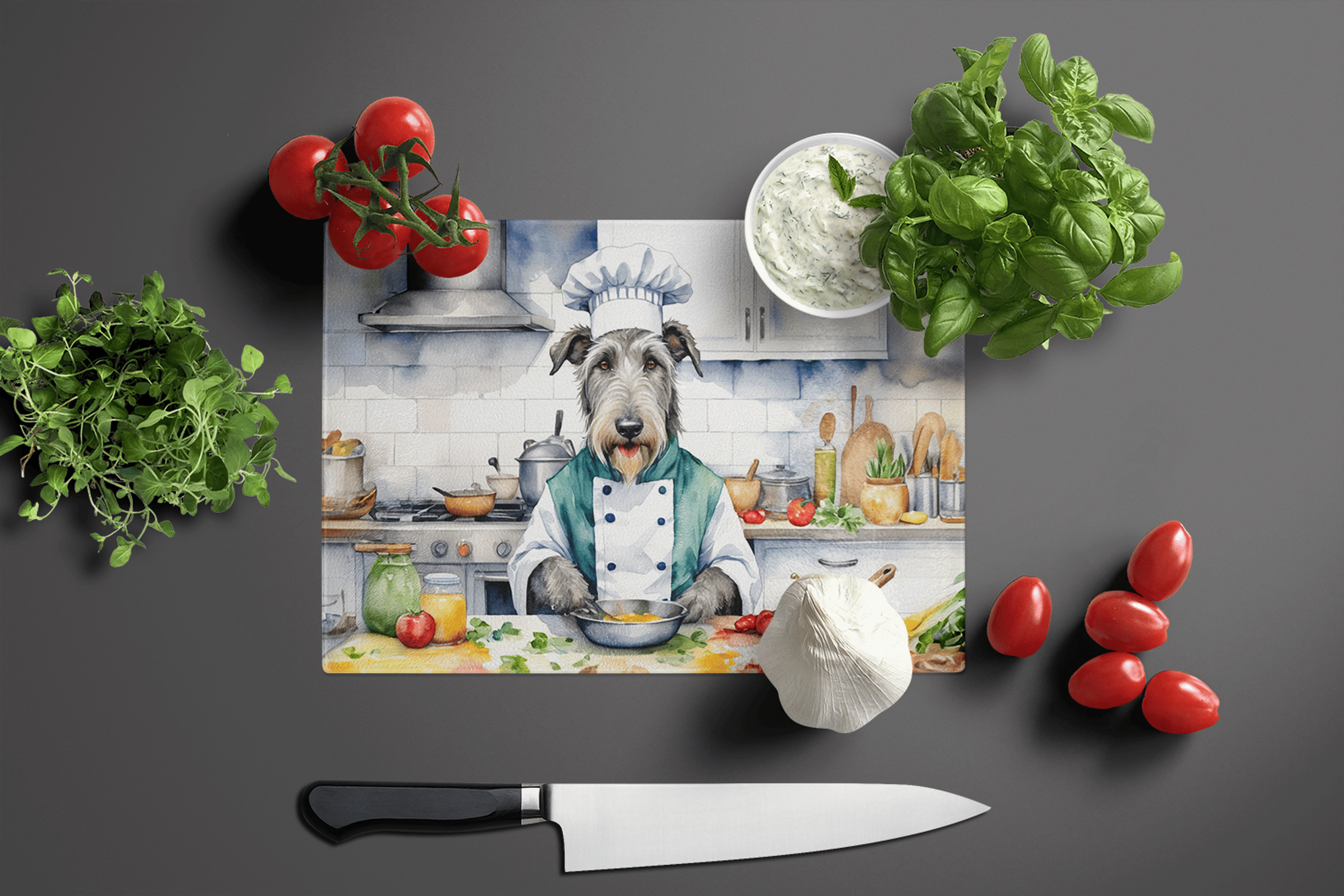 Bring elegance and personality to your kitchen with the Irish Wolfhound The Chef Glass Cutting Board, featuring a distinguished Irish Wolfhound dressed as a chef in delightful, artistic detail. Made from durable tempered glass, this cutting board offers a non-porous, stain- and odor-resistant surface ideal for slicing meats, chopping veggies, or serving snacks in style. It’s both a practical culinary tool and a unique decorative accent for dog lovers and fans of whimsical kitchen décor.