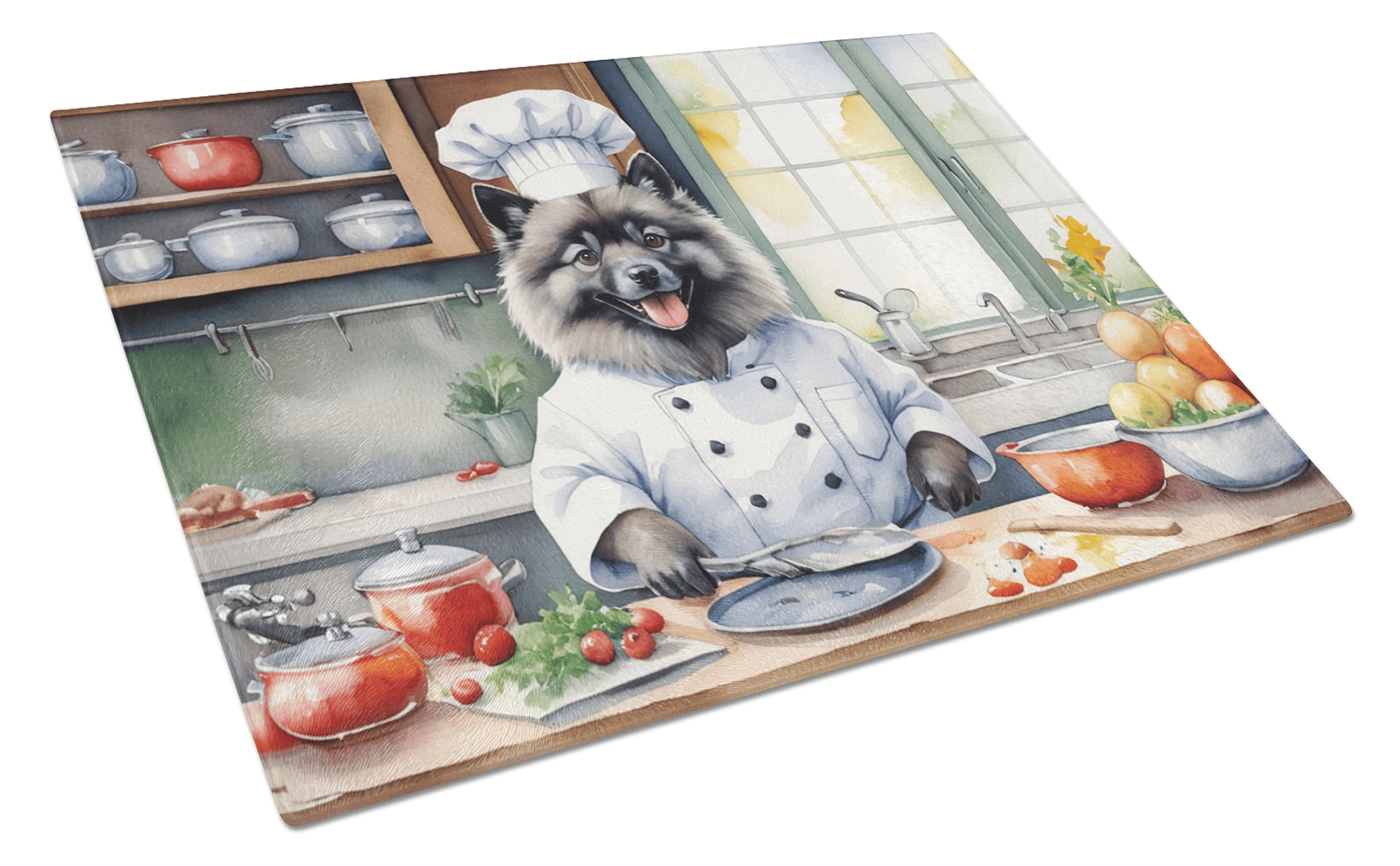 Brighten up your kitchen with the Keeshond The Chef Glass Cutting Board, featuring a fluffy and cheerful Keeshond dressed as a chef in playful, detailed artwork. Made from durable tempered glass, this board provides a non-porous, stain- and odor-resistant surface that's ideal for chopping veggies, slicing meats, or serving appetizers. It’s a perfect blend of functionality and decorative charm, making it a thoughtful gift for dog lovers and fans of whimsical kitchenware.