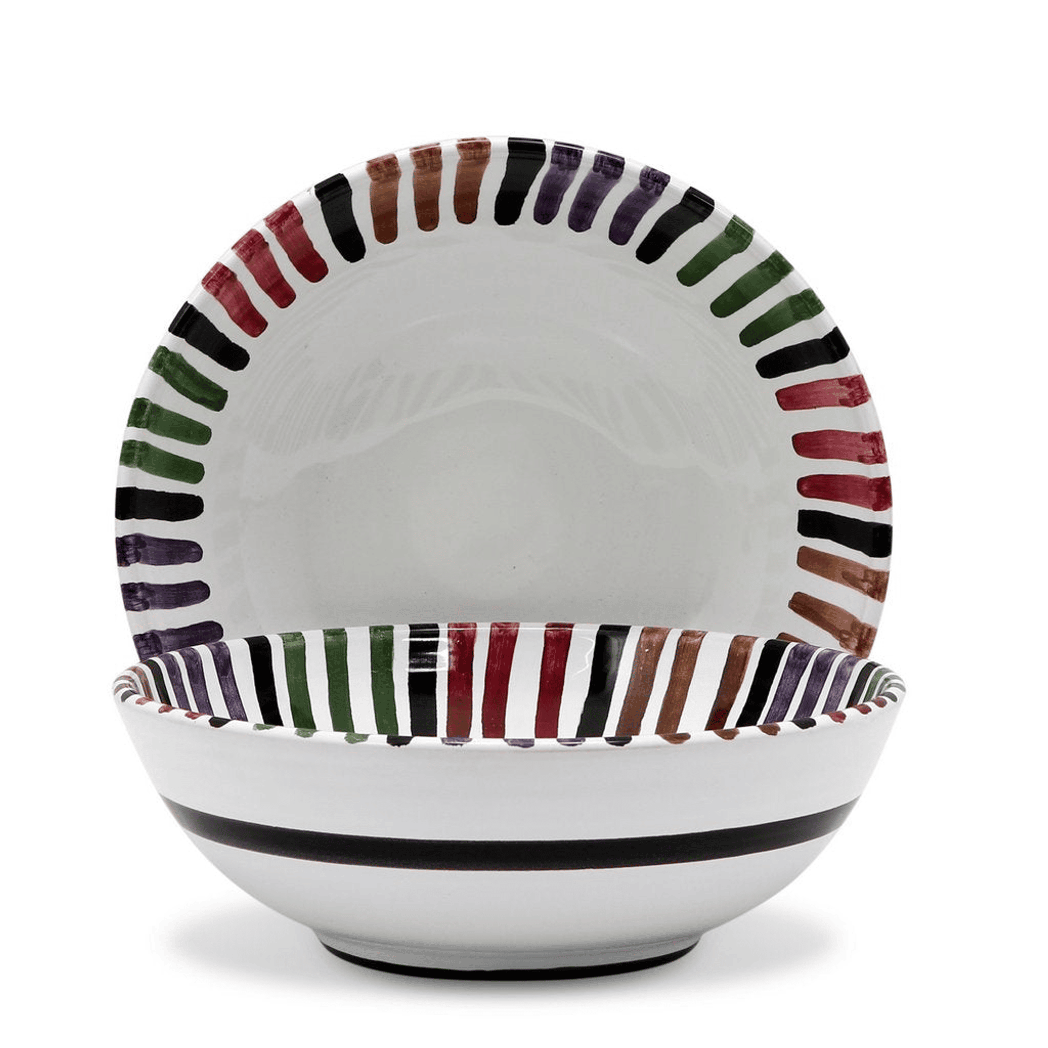 Its unique design comprises colored brush strokes bordering the rim in black, green, purple, brown and red.