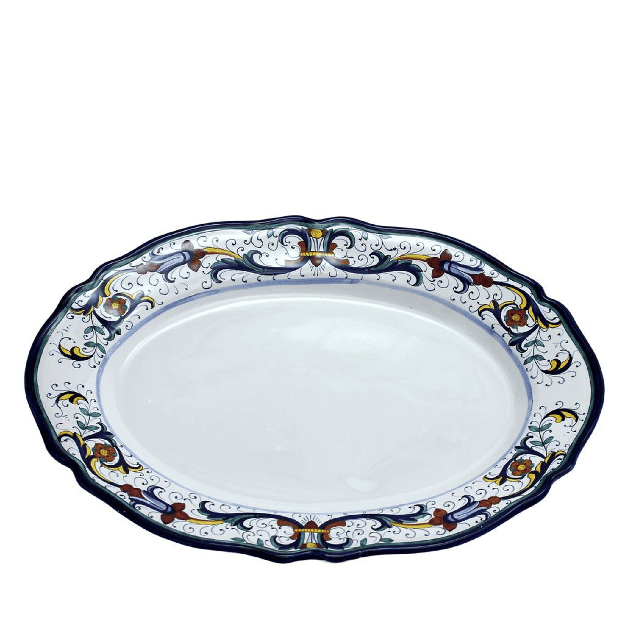 VECCHIA DERUTA Collection: (Old Deruta) - The authentic richer and more formal version of the renowned Ricco Deruta pattern.Scalloped rim platesfeaturing the traditionalroyal blue, yellow gold, and emerald greencreating a brilliant elegance to bring royal elegance to your table.
