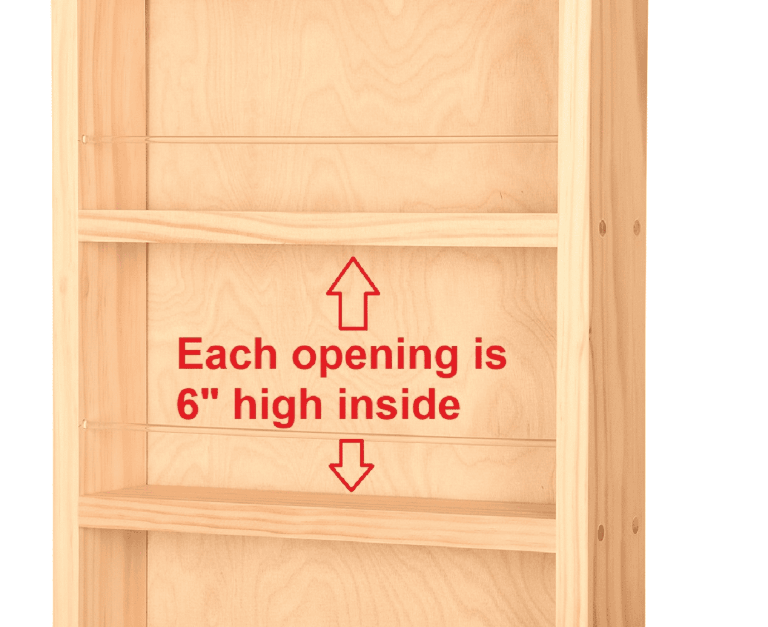 Handcrafted by artisans right here in the USA. Can be mounted on the wall or side of a cabinet. This rack can also be mounted on a hollow-core door such as a pantry door with special included fasteners. Clear acrylic dowels help hold things in on each shelf, while the inset back panel hides the wall behind the rack! Easy to mount on the wall with screws and anchors provided. Available in ten different heights, 2 widths, 3 depths and unfinished, pre-primed for painting, or white enamel finish. Nine openings measuring 6"h x 9.5"w. Usable depth on each shelf is 4". Overall rack measures 62"h x 11"w x 4.5"d. SOLID PINE construction, screwed together to last a lifetime. Unfinished bare wood can be painted or stained as desired.
