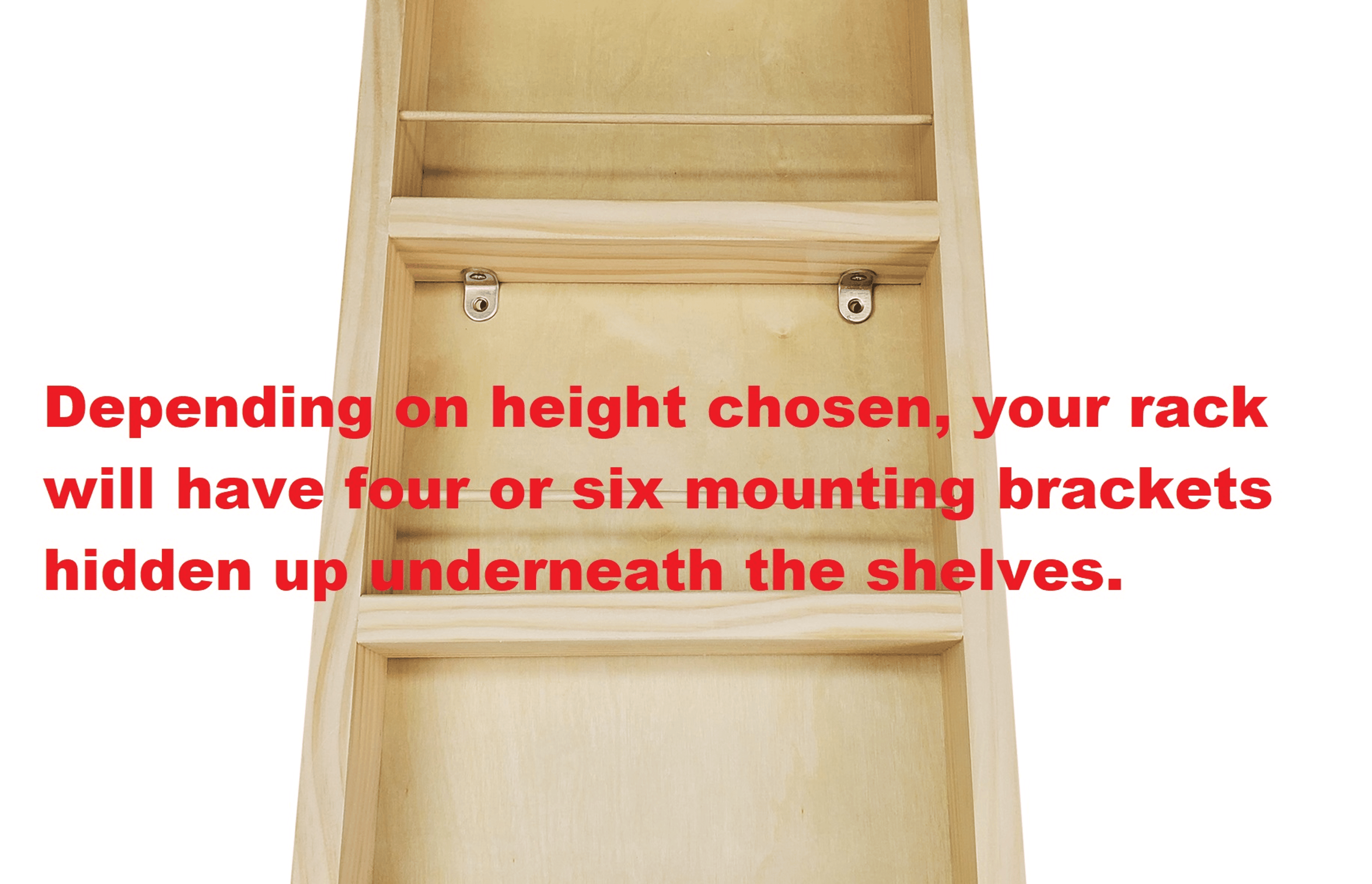 Handcrafted by artisans right here in the USA. Can be mounted on the wall or side of a cabinet. This rack can also be mounted on a hollow-core door such as a pantry door with special included fasteners. Clear acrylic dowels help hold things in on each shelf, while the inset back panel hides the wall behind the rack! Easy to mount on the wall with screws and anchors provided. Available in ten different heights, 2 widths, 3 depths and unfinished, pre-primed for painting, or white enamel finish. Nine openings measuring 6"h x 9.5"w. Usable depth on each shelf is 4". Overall rack measures 62"h x 11"w x 4.5"d. SOLID PINE construction, screwed together to last a lifetime. Unfinished bare wood can be painted or stained as desired.
