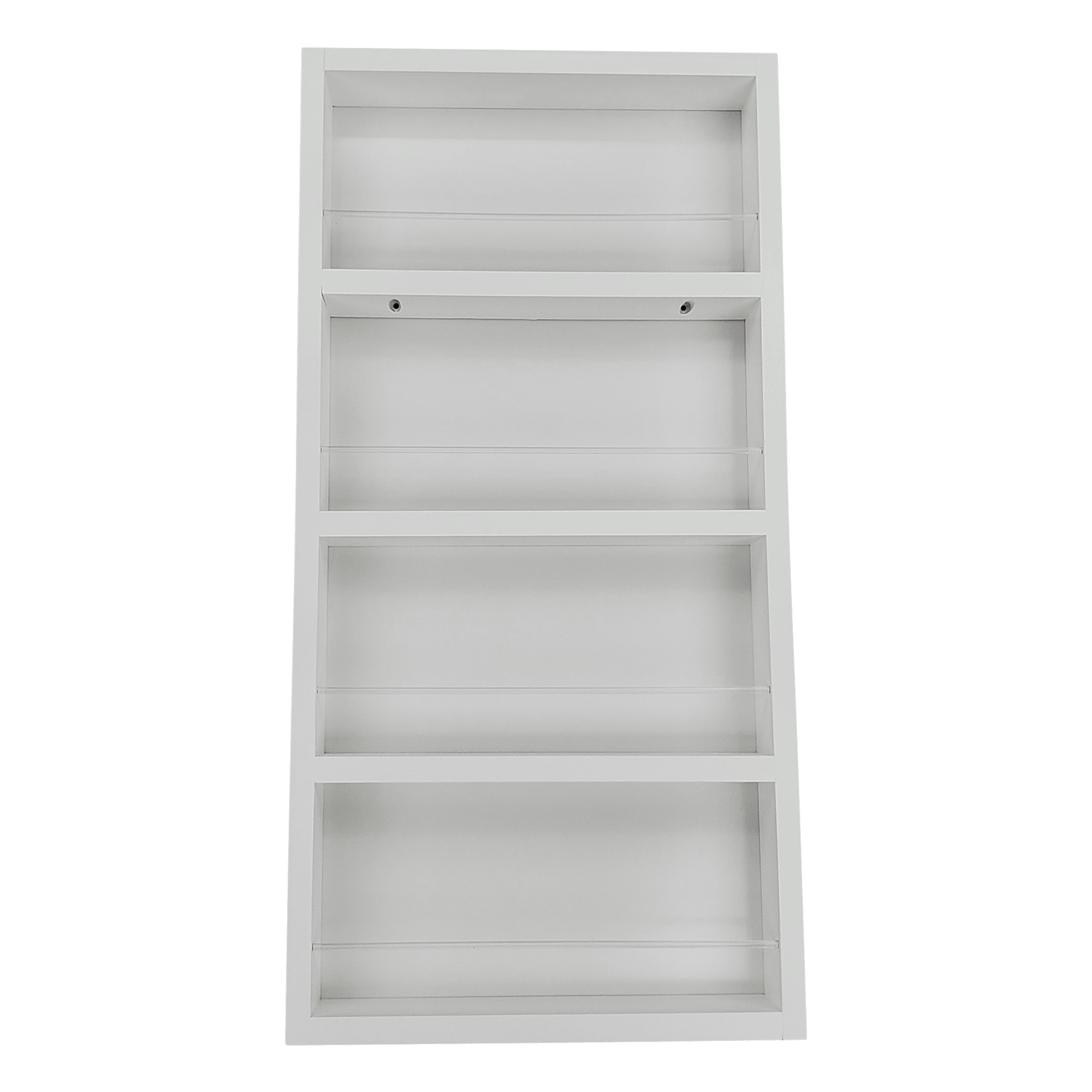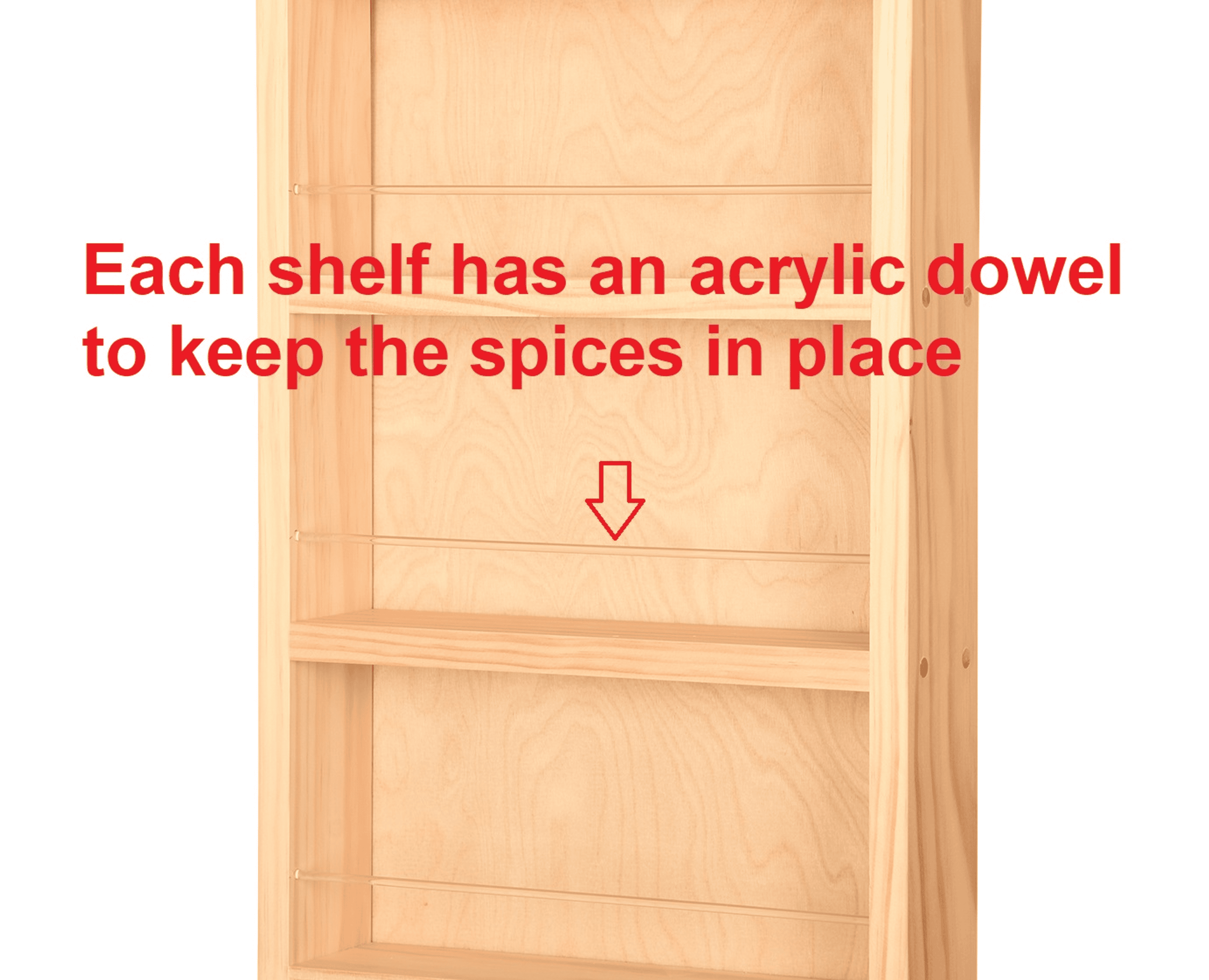 Handcrafted by artisans right here in the USA. Can be mounted on the wall or side of a cabinet. This rack can also be mounted on a hollow-core door such as a pantry door with special included fasteners. Clear acrylic dowels help hold things in on each shelf, while the inset back panel hides the wall behind the rack! Easy to mount on the wall with screws and anchors provided. Available in ten different heights, 2 widths, 3 depths and unfinished, pre-primed for painting, or white enamel finish. Nine openings measuring 6"h x 9.5"w. Usable depth on each shelf is 4". Overall rack measures 62"h x 11"w x 4.5"d. SOLID PINE construction, screwed together to last a lifetime. Unfinished bare wood can be painted or stained as desired.