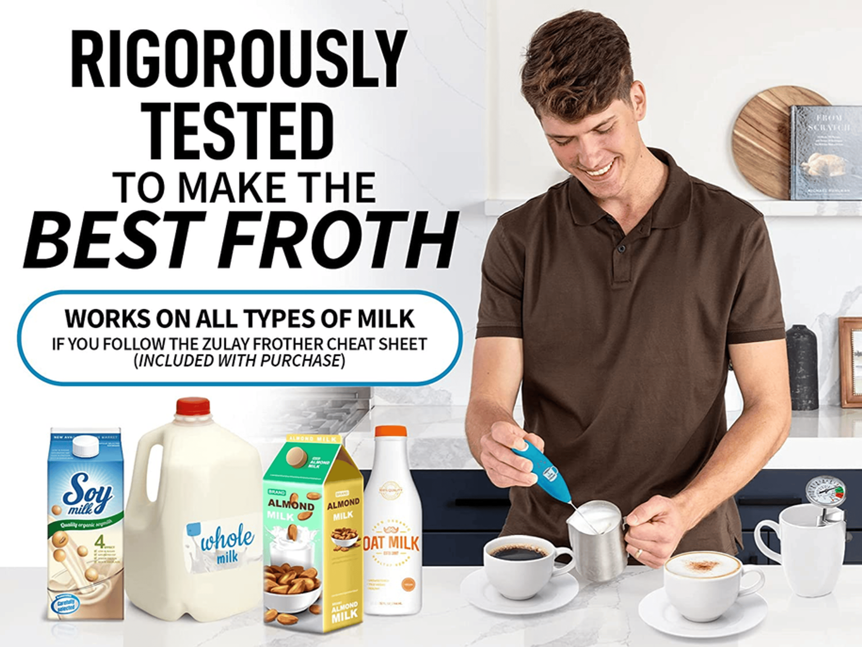 • Compatible with all types of milk, including whole, soy, almond, cashew, hazelnut, cream, and half-and-half.